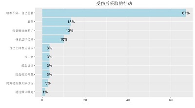 但是受伤的被访者中,多数都不会申请工伤认定,而是会选择自己来承受,在受访者中,67%的人都选择“啥也不做,自己忍着”,选择和企业一方私了的有13%,选择寻求法律援助的有10%。受访者很少直接选择劳动监察、仲裁、诉讼等手段。